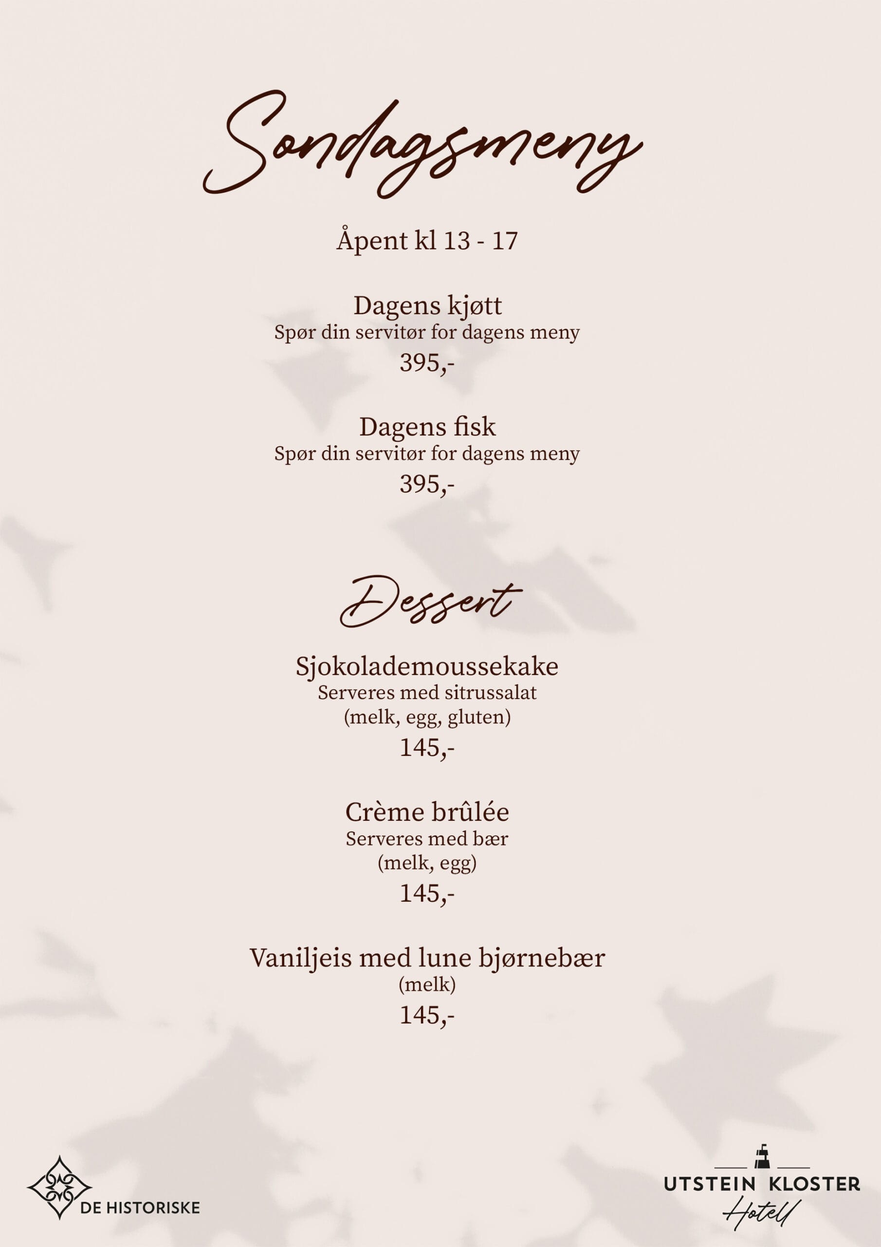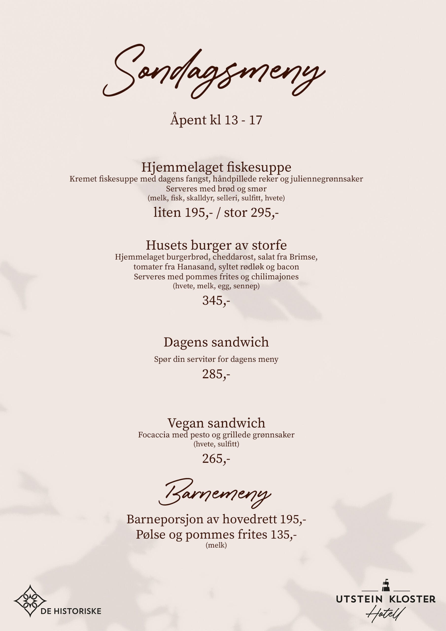 Ta med deg dem du setter pris på, og nyt et herlig måltid i våre naturskjønne omgivelser. Vår utsøkte søndagsmiddag er laget med de beste lokale råvarene, og vi legger stor vekt på kortreist mat for å gi deg en smakfull opplevelse.